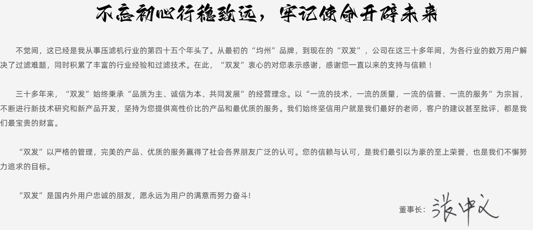“濾污水為清泉,變污泥為凈土,還廢礦渣為青山綠地”,誠(chéng)信塑品牌,質(zhì)量鑄品牌。三十多年來(lái),“雙發(fā)” 始終秉承 “品質(zhì)為主、誠(chéng)信為本、共同發(fā)展” 的經(jīng)營(yíng)理念,持續(xù)開(kāi)展新技術(shù)研究和新產(chǎn)品開(kāi)發(fā),堅(jiān)持為用戶提供高性價(jià)比的產(chǎn)品和優(yōu)質(zhì)的服務(wù)。
